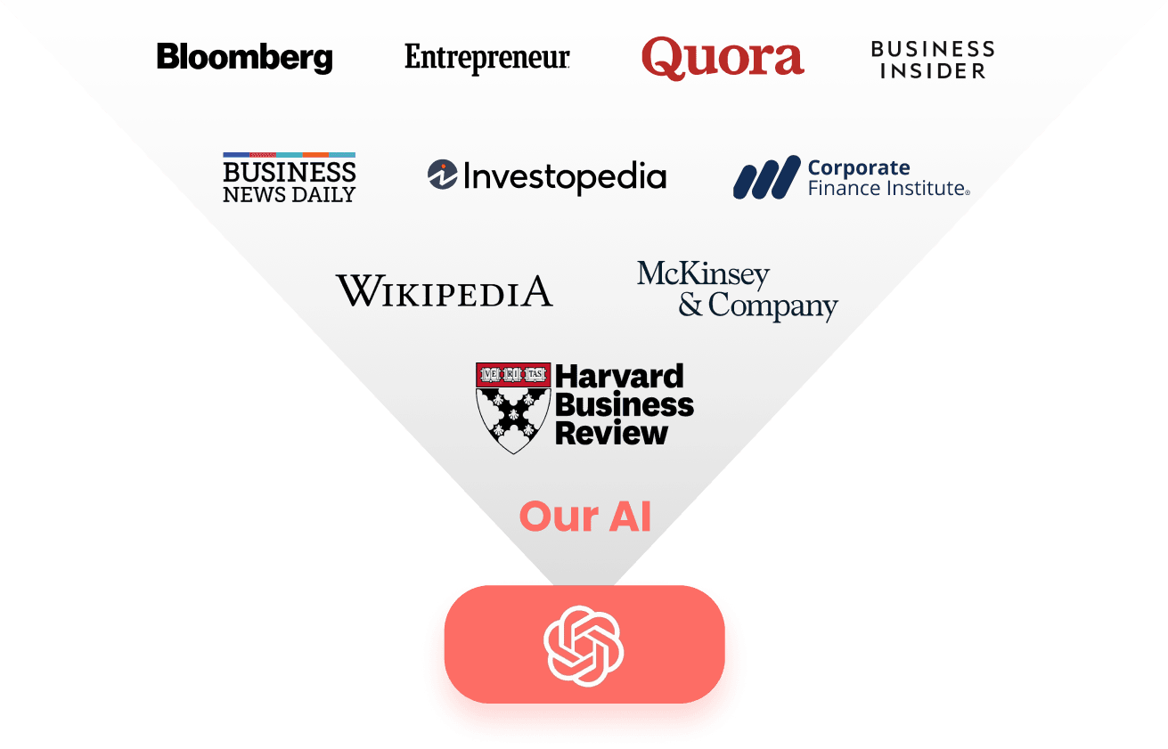 GPT-3.5 and GPT-4 are our cutting-edge language models, trained on vast quantities of internet, book-based resources, business plan examples, and has demonstrated its knowledge by passing the Wharton MBA exam among many others